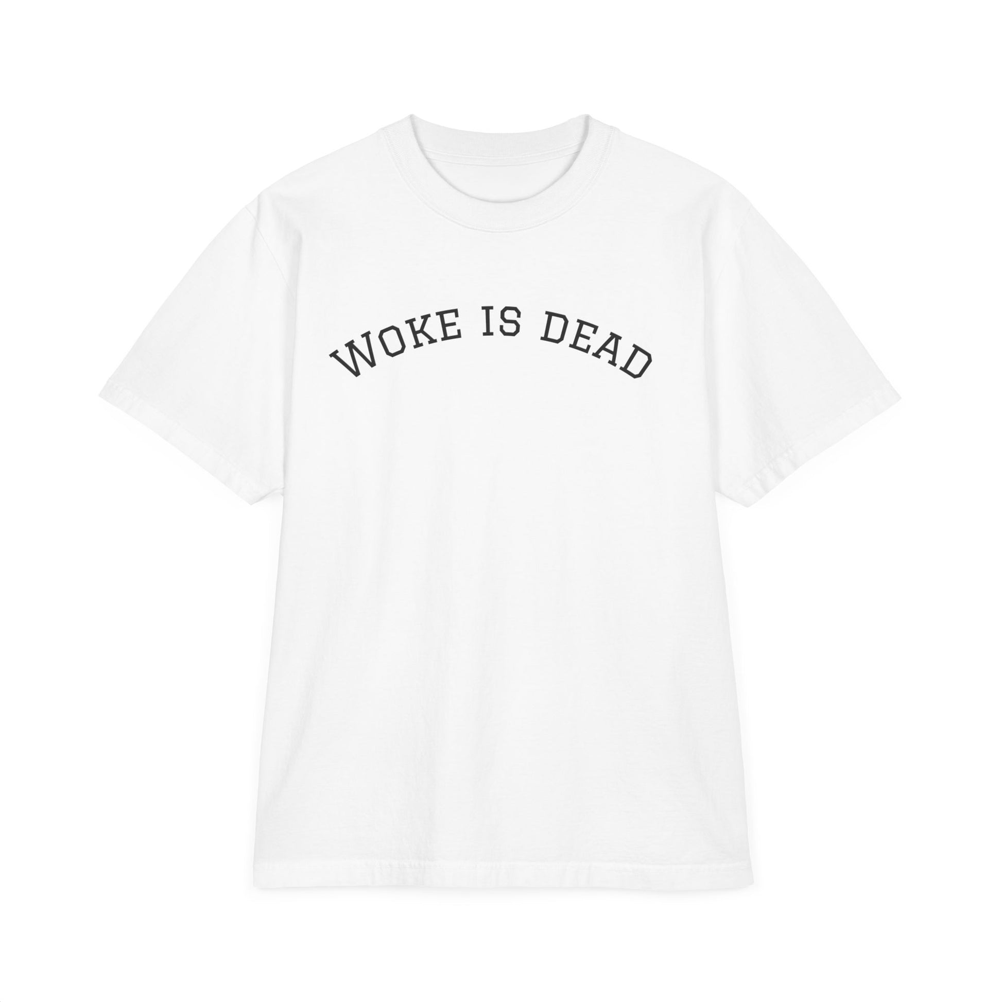 Bold front print: WOKE IS DEAD in glitch or stencil style